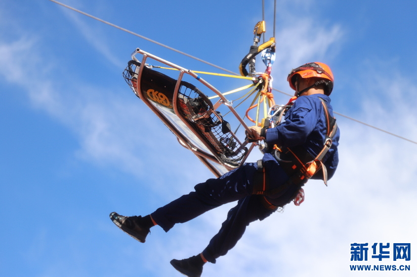 隊(duì)員正在進(jìn)行繩索救援訓(xùn)練(6月6日攝)。(新華網(wǎng)發(fā) 劉論剛攝)