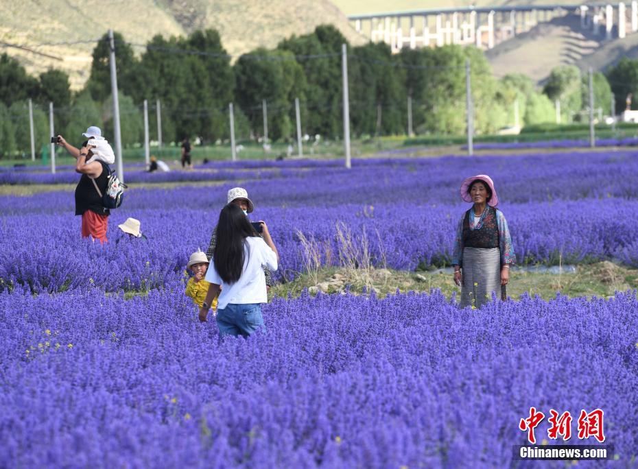 6月25日,位于西藏自治區(qū)拉薩市達(dá)孜區(qū)新倉村貝拉莊園的100畝薰衣草花海競相綻放,吸引不少游客和當(dāng)?shù)厥忻袂皝碛瓮?、拍照。中新社記?貢嘎來松 攝