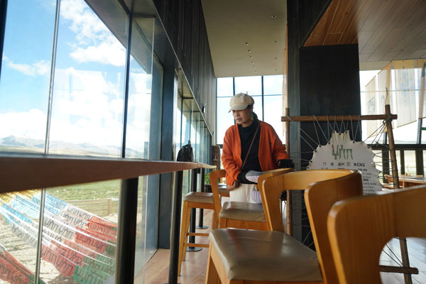 從正門進(jìn)入,穿過牦牛文化空間走廊,便可到能夠以最佳視角欣賞念青唐古拉山的VR觀景臺。緊鄰觀景臺右側(cè),是一間擺放當(dāng)?shù)匚膭?chuàng)產(chǎn)品、各類書籍的觀景咖啡廳。該咖啡廳的兩面墻體設(shè)計為超大落地窗,在此休息的游客可以邊品嘗咖啡,邊欣賞念青唐古拉山及拉多草原的美景。走進(jìn)咖啡廳,記者看到不少在這里休息的游客都在低頭寫著什么,經(jīng)咖啡廳負(fù)責(zé)人介紹:“這些游客是在寫明信片,我們這里不僅提供餐飲,還提供印有本地風(fēng)景的明信片,并同中國郵政合作,幫助游客按時將明信片寄到他們的親朋好友手中,讓游客們的旅途變得更有意義?!?/p>