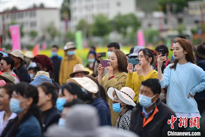 圖為西藏自治區(qū)拉薩市墨竹工卡縣小油菜花文化旅游節(jié)現(xiàn)場游客拿出手機拍攝節(jié)目。貢嘎來松 攝