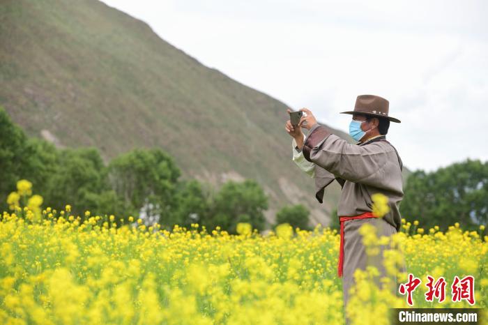圖為一位村民在油菜花海里拍視頻。貢嘎來松 攝