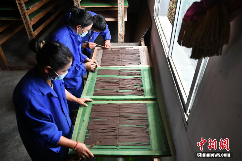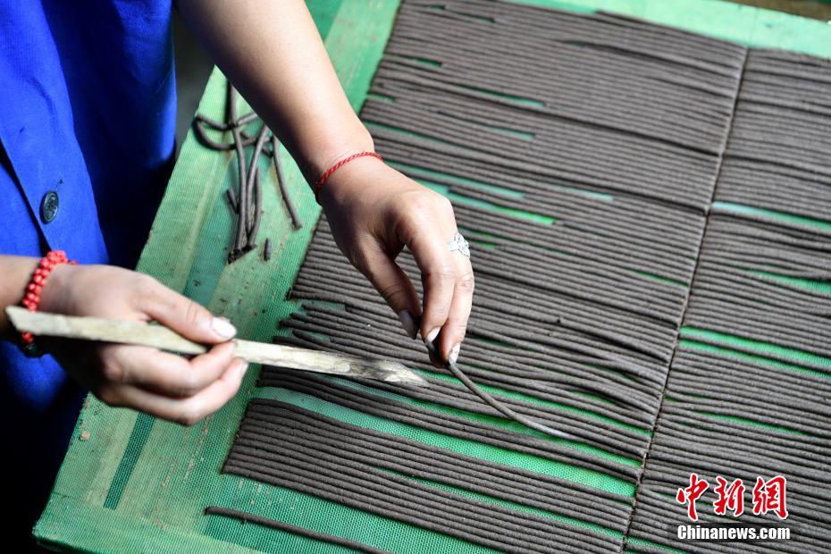 7月22日,西藏自治區(qū)林芝市察隅縣塔林村“察隅旺扎藏香”生產(chǎn)合作社的工人用紗網(wǎng)接藏香。2014年,“察隅旺扎藏香”生產(chǎn)合作社成立,生產(chǎn)主要由白檀香和紫檀香、沉香、丁香等30多種純天然珍貴藥材及香料制成的藏香,目前年收益可達(dá)十余萬元人民幣。合作社不僅帶動了當(dāng)?shù)厝藛T就業(yè),也推動藏香經(jīng)濟(jì)進(jìn)一步發(fā)展,促進(jìn)農(nóng)牧民增收。 中新社記者 李嘉嫻 攝