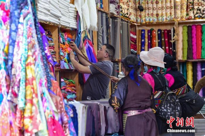 圖為7月24日,幾位藏族婦女在拉薩老城區(qū)八廓街上的藏裝店內(nèi)選購(gòu)藏裝。中新社記者 貢嘎來松 攝
