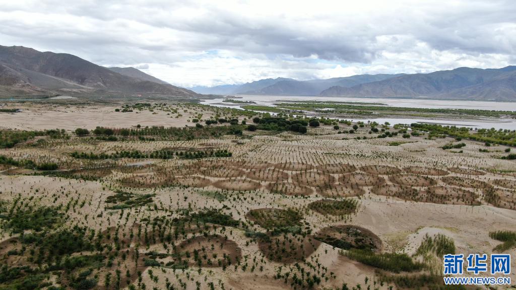 雅魯藏布江山南段沙丘上人工造林的樹苗(7月20日 無人機(jī)攝)。新華社記者 晉美多吉 攝