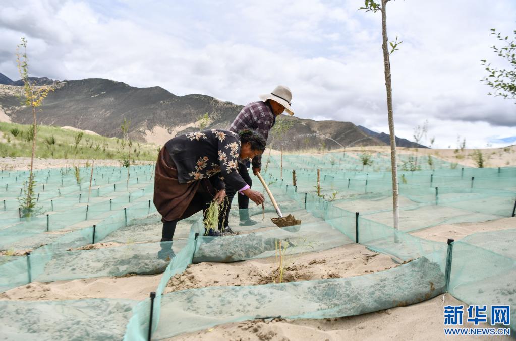 在山南市全國防沙治沙綜合示范區(qū),當(dāng)?shù)厝罕娫谏车厣显苑N樹苗(7月20日攝)。新華社記者 晉美多吉 攝