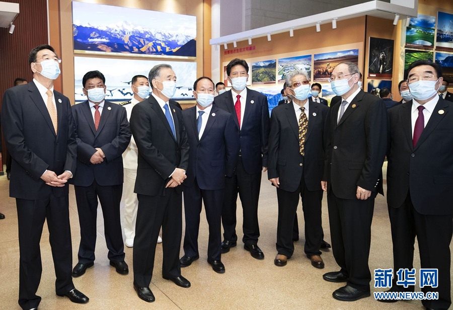 汪洋等走進展廳,一邊仔細觀看展板,一邊認真聽取講解?!妒邨l協(xié)議》簽字儀式歷史照片、實行民族區(qū)域自治制度的展板、對口援藏資金圖表、《西藏自治區(qū)民族團結(jié)進步模范區(qū)創(chuàng)建條例》圖片……一塊塊展板、一張張圖片圖表,生動展現(xiàn)了70年來西藏在黨的領(lǐng)導下取得的長足發(fā)展。汪洋不時駐足觀看,詳細詢問有關(guān)情況,對西藏近年來各項事業(yè)取得的成就予以充分肯定。