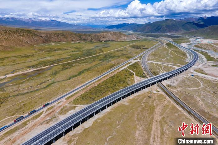 那拉高速(畫面下方)、青藏公路和遠處的雪山。 江飛波 攝