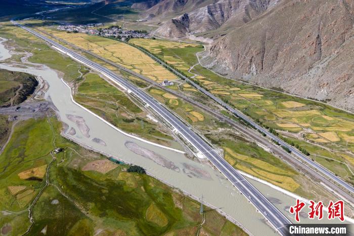 圖為8月27日,航拍西藏那拉高速堆龍德慶段田園風光?!〗w波 攝