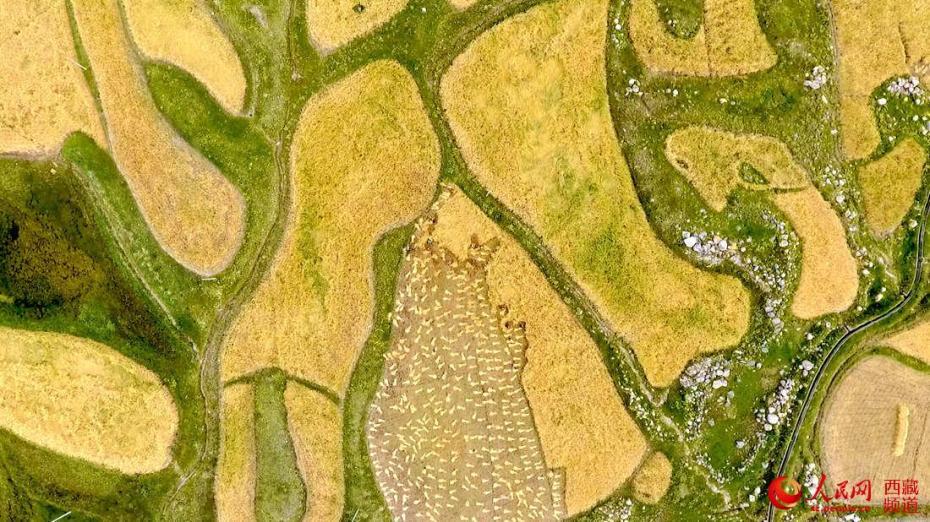 九月的西藏,已進(jìn)入青稞成熟收割時節(jié)。記者來到拉薩市曲水縣熱堆村,成片成片成熟了的青稞,金黃耀眼。村民們抓緊天氣晴好的時機(jī),互幫互助忙收割,確保顆粒歸倉。地頭田間,有的已被割倒束成捆,也有的仍在迎風(fēng)搖曳,等待收割,村民們揮舞著鐮刀,將成熟的青稞收割、扎捆、然后堆砌成一排排整齊的青稞垛子,用拖拉機(jī)將青稞運(yùn)回家,再上架晾曬,看著沉甸甸的麥穗,聞著空氣中彌漫著沁人心脾的青稞香,村民們臉上露出了喜悅的微笑。無人機(jī)鳥瞰青稞田地。人民網(wǎng) 次仁羅布攝