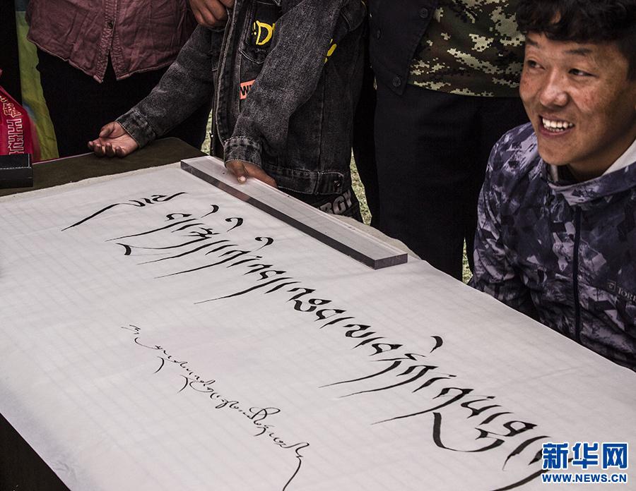 9月23日,群眾在活動現(xiàn)場觀賞藏文書法。新華網(wǎng) 達(dá)次 攝