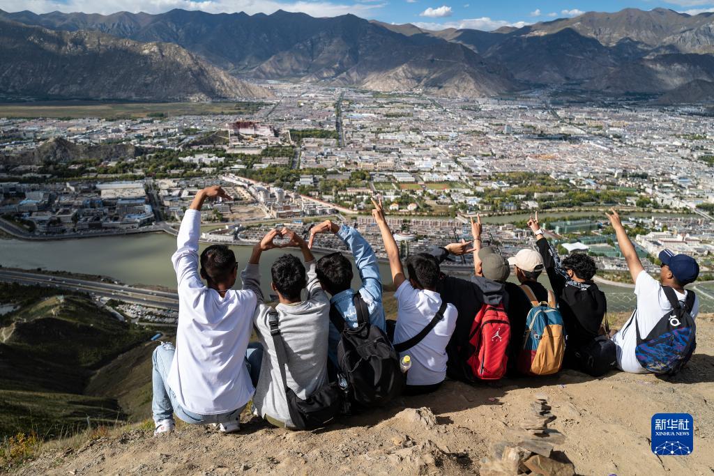 一群大學生在拉薩市南山生態(tài)園的祖國萬歲山山頂合影(9月20日攝)。新華社記者 孫瑞博 攝