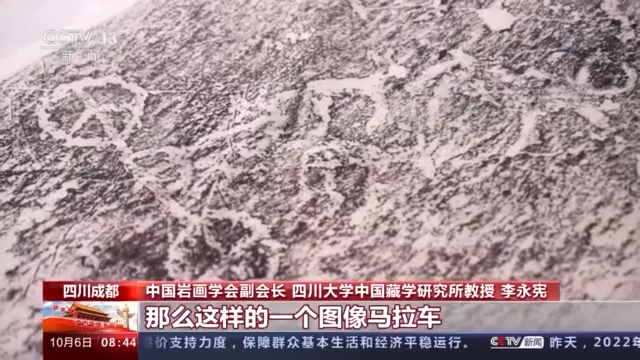 中國巖畫學(xué)會副會長、四川大學(xué)中國藏學(xué)研究所教授 李永憲:那么這樣的一個圖像馬拉車,騎馬的人、牦牛、三只鹿、公鹿,所有的動物、人物、車輛,它們都是朝一個方向行進。