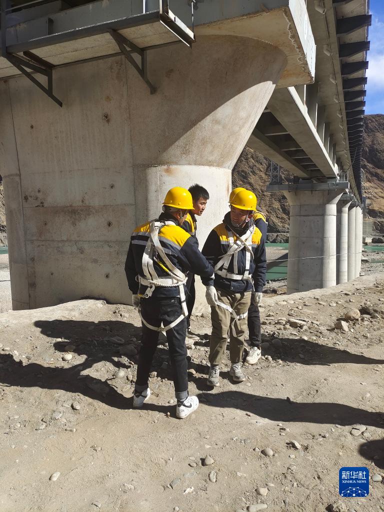 冷達(dá)2號雅魯藏布江特大橋橫跨雅魯藏布江。“90后”橋隧工趙浩澤穿著亮黃色安全馬甲,系好安全帶,開始檢查抗震樁、支座和支撐墊石的情況。