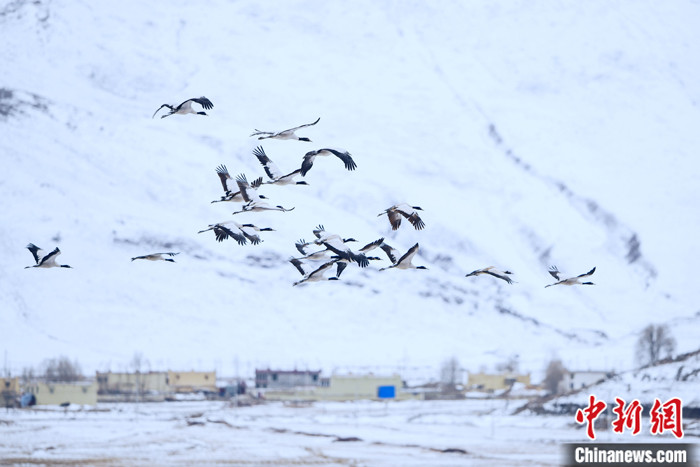 圖為2月23日,西藏林周縣虎頭山水庫附近村莊上空,一群黑頸鶴飛過,遠(yuǎn)處白雪皚皚。中新社記者 江飛波 攝