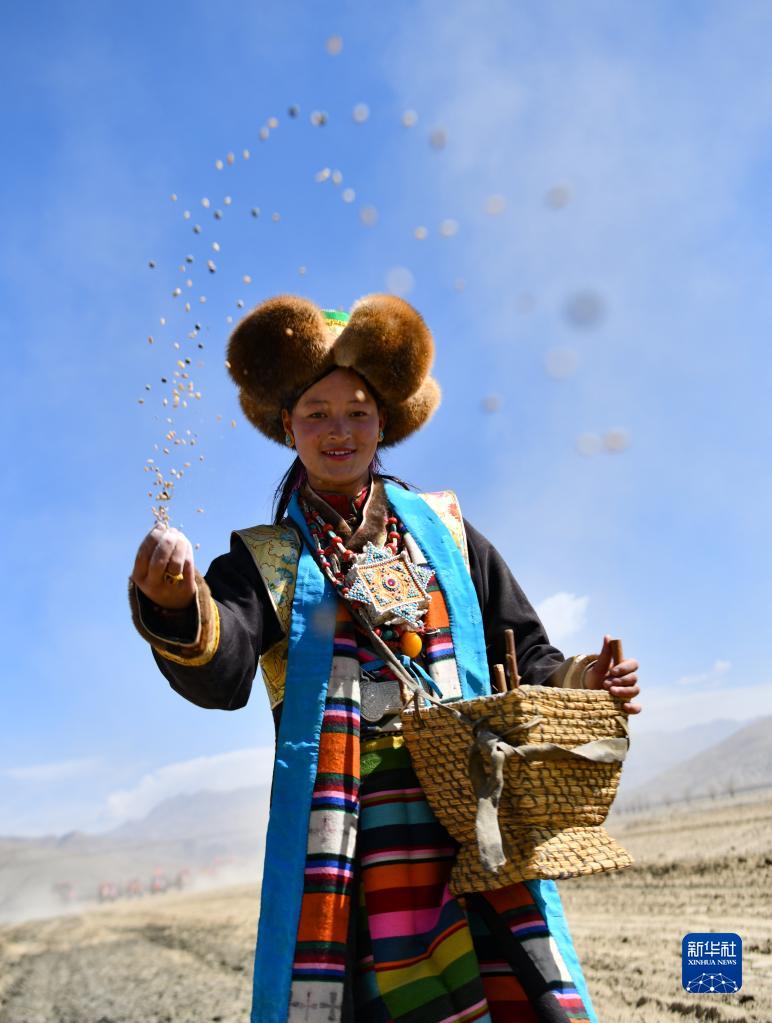 村民在西藏日喀則市江孜縣努康村參加春耕儀式時(shí)播撒種子(3月16日攝)。新華社記者 晉美多吉 攝