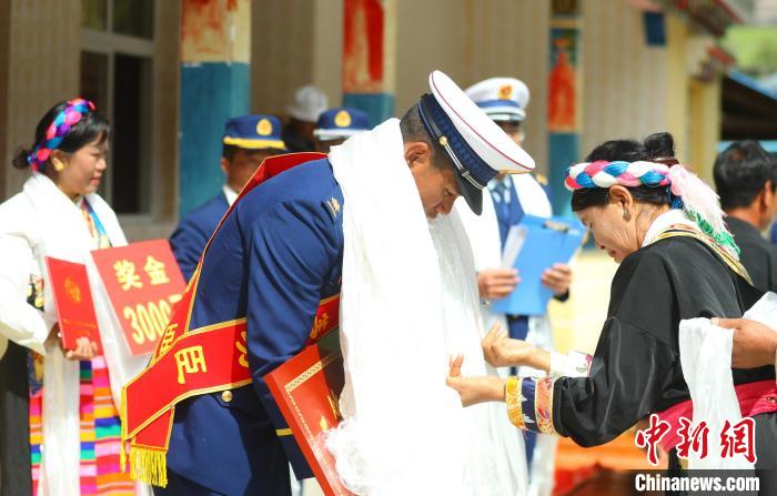 圖為村民為巴桑旺堆獻(xiàn)上哈達(dá)。西繞拉翁 攝