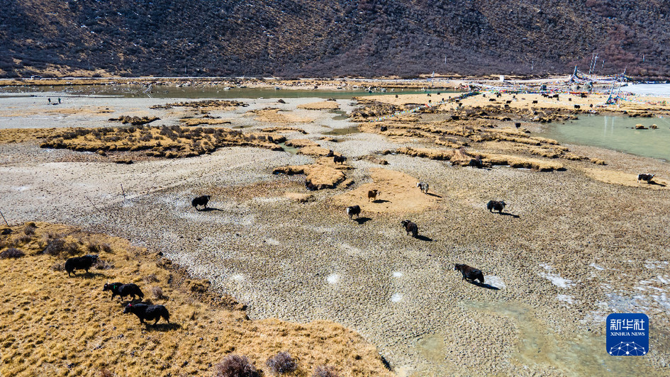 西藏娘亞牦牛養(yǎng)殖產(chǎn)業(yè)發(fā)展有限責(zé)任公司的牦牛在牧場(chǎng)上活動(dòng)(3月30日攝,無(wú)人機(jī)照片)。新華社記者 周荻瀟 攝