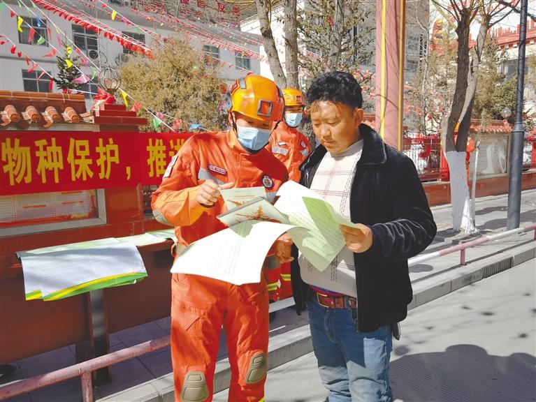 昌都市森林消防支隊邊壩縣駐防分隊隊員向群眾宣傳野生動植物保護(hù)知識。記者 桑鄧旺姆 攝