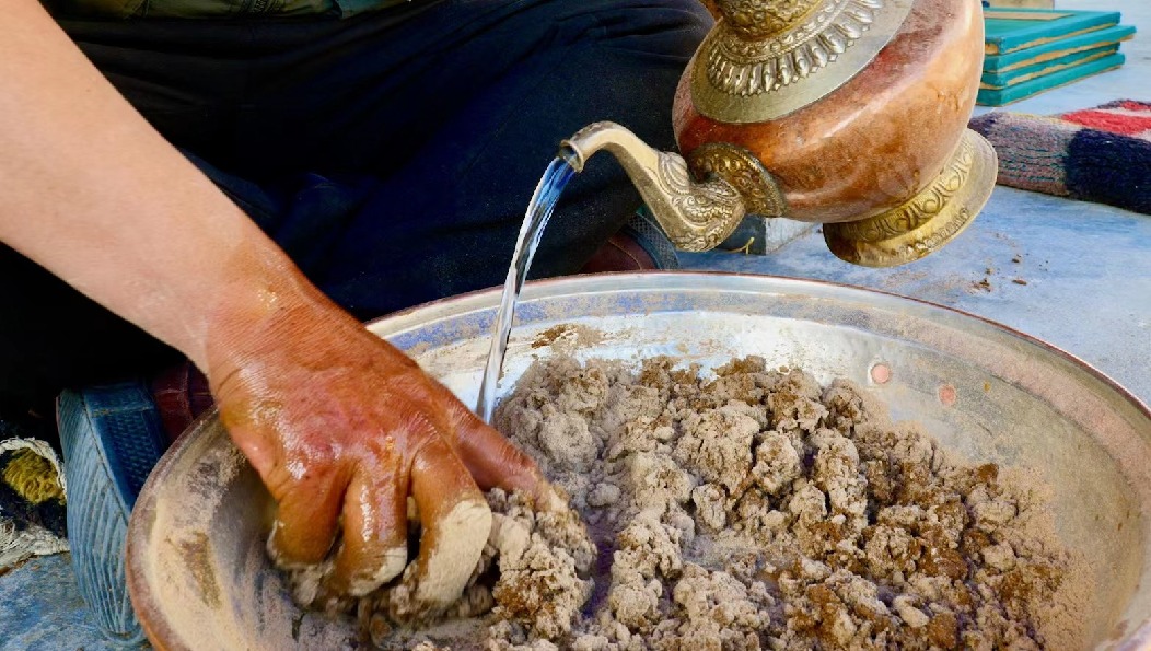 靜謐的午后,空氣里都是柏木的清香。次仁多吉盤(pán)坐在遮陽(yáng)傘下,伴著周圍清脆的流水、水磨聲,輕揉著手中的香泥。隨后他用手一抓,迅速將香泥擠進(jìn)帶孔的牛角器中,身子微微前傾,手指用上巧勁,一根根藏香便排在紗網(wǎng)之上。