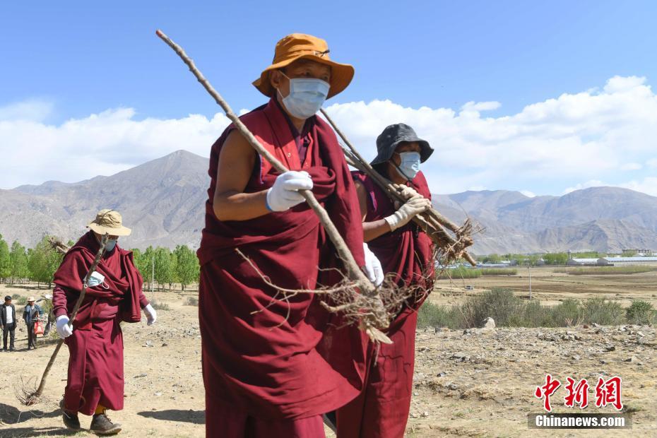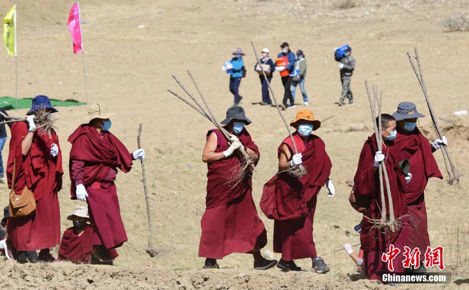 4月15日,西藏大昭寺僧人等在蔡公堂鄉(xiāng)植樹。當(dāng)日,西藏大昭寺在拉薩市城關(guān)區(qū)蔡公堂鄉(xiāng)啟動拉薩南北山2800余畝山地綠化工程項目。 中新社記者 貢嘎來松 攝
