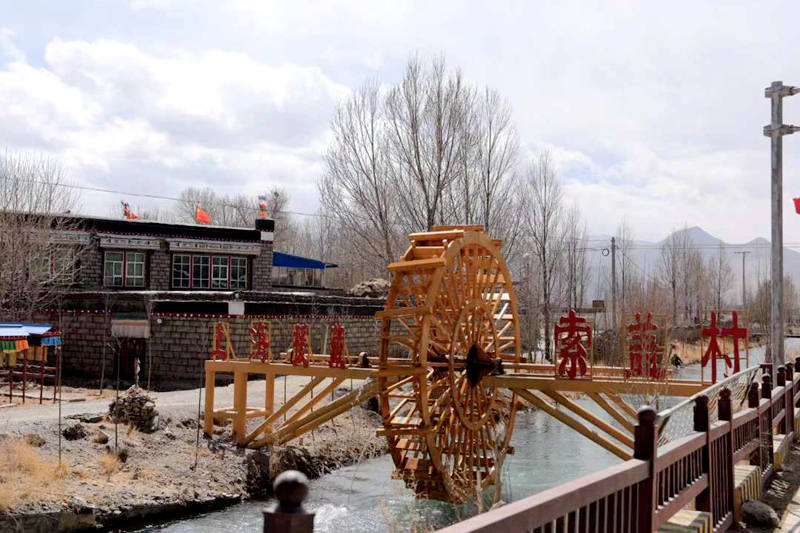 走進(jìn)索蓋村,映入眼簾的就是一架大水車(chē),上面刻著“上海援藏 索蓋村”四個(gè)小字、三個(gè)大字。