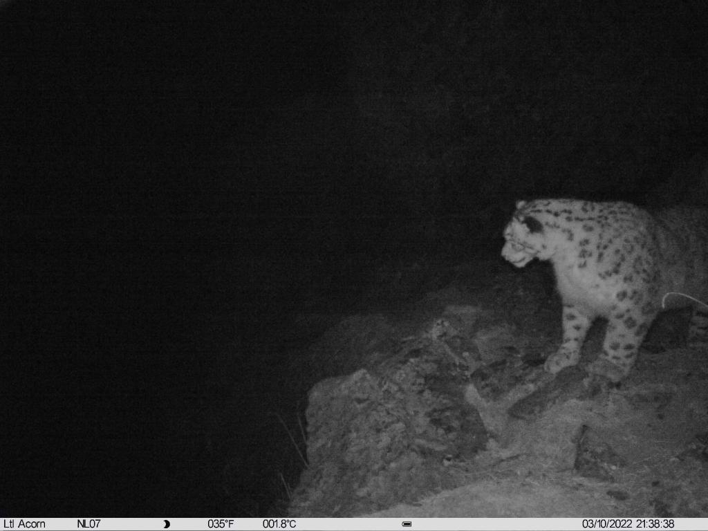 紅外相機(jī)監(jiān)測照片顯示,今年3月,一只成年雪豹走到了一臺(tái)位于山脊線上的紅外相機(jī)觸發(fā)裝置前,不斷地上前用鼻子觸碰,并且淘氣地在鏡頭前呼出了一股熱氣。