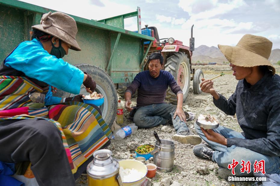 日喀則桑珠孜區(qū)農(nóng)牧民占堆(中)一家人在田間午餐。 江飛波 攝