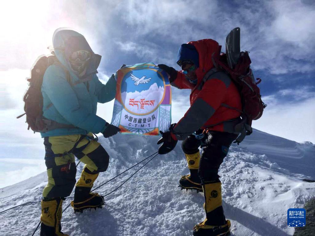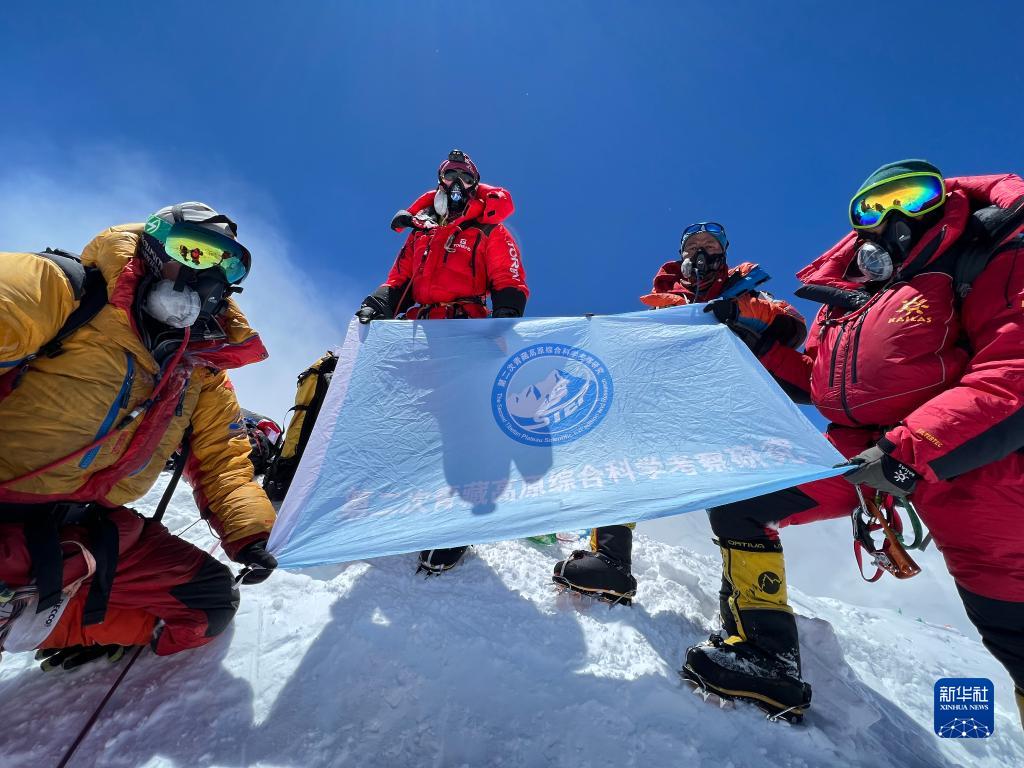 在珠穆朗瑪峰峰頂,科考隊員展示第二次青藏高原綜合科學(xué)考察研究旗幟。