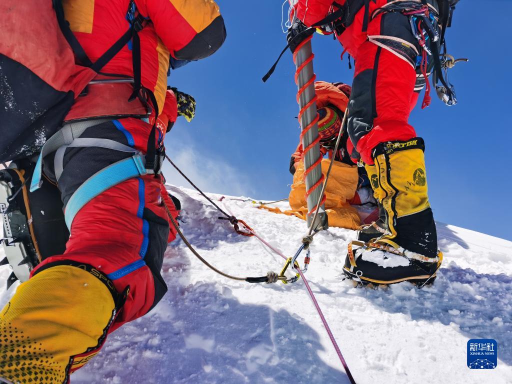 2022年5月4日,科考隊員在珠峰峰頂采集冰雪樣品。