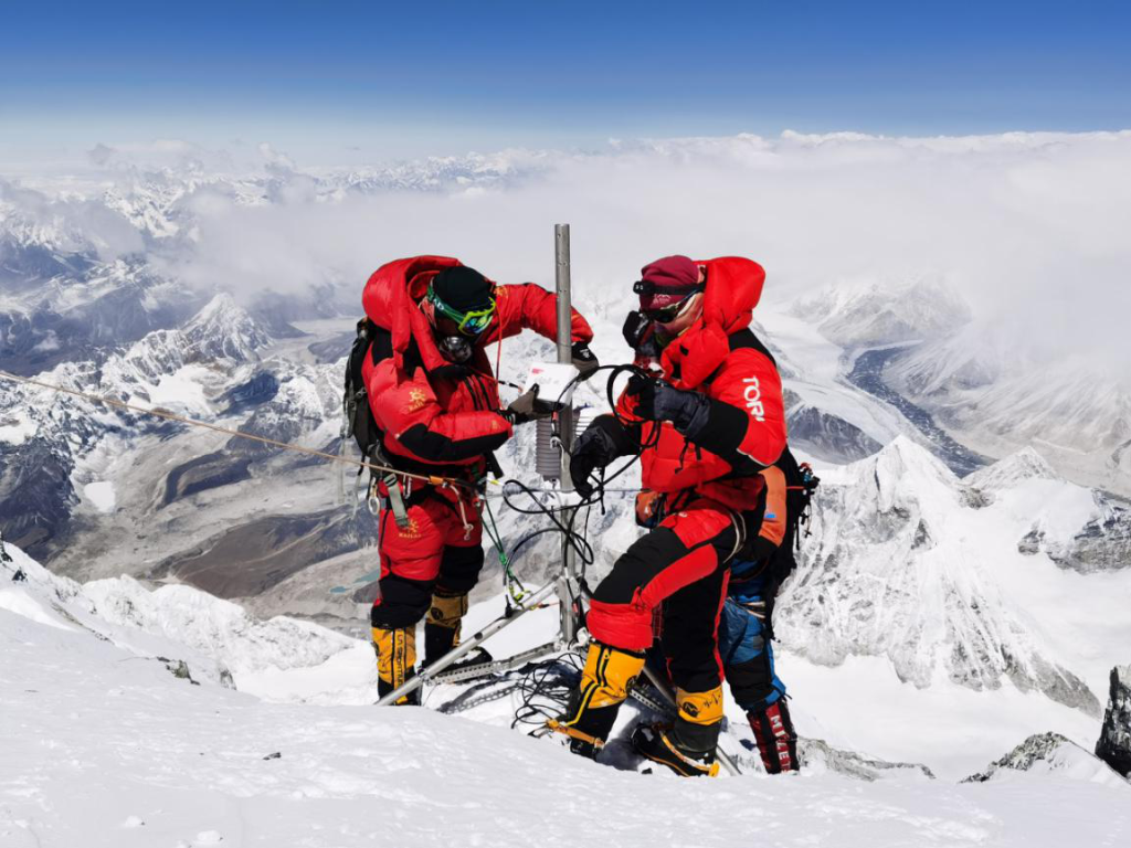 科考隊員在珠峰架設自動氣象站。新華社特約記者 索朗多吉 攝