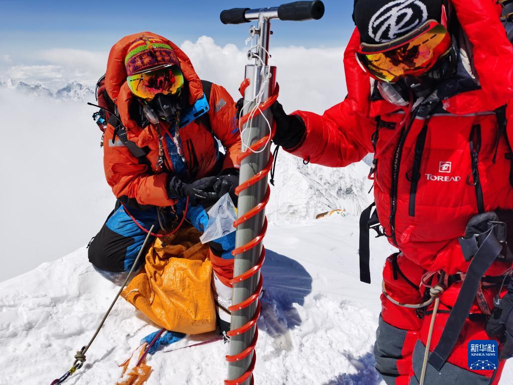 5月4日,德慶歐珠帶領(lǐng)的登頂小組科考隊(duì)員,在珠峰海拔8830米處架設(shè)世界海拔最高自動(dòng)氣象站,建成珠峰梯度氣象觀測體系;在峰頂首次利用高精度雷達(dá)測量冰雪厚度,并采集了峰頂冰雪樣品。