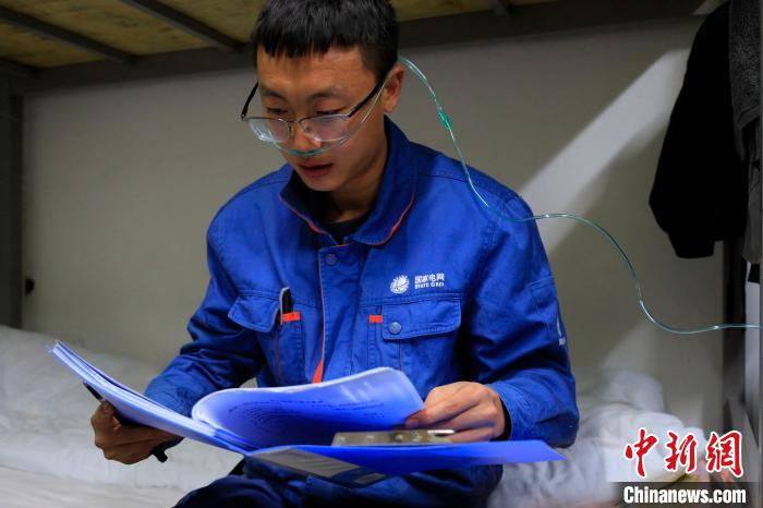 圖為付新程完成當(dāng)日的檢修工作,在宿舍內(nèi)一邊吸氧氣,一邊研究工作方案。孟瑋 攝