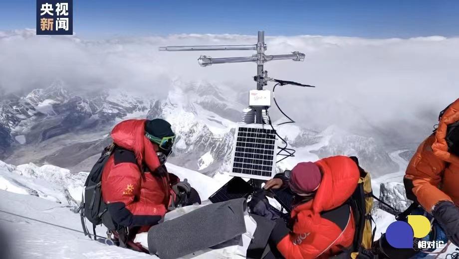 登頂科考隊(duì)員們?cè)诤0?830米架設(shè)自動(dòng)氣象站