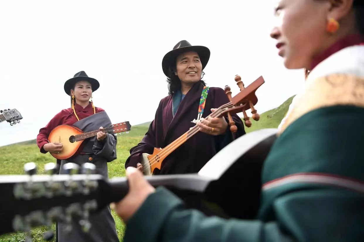 格薩爾彈唱藝人在草原上彈唱格薩爾。新華社記者 陳斌 攝