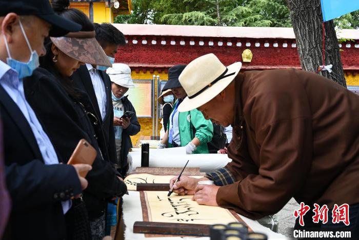 圖為活動現場,藏文書法展示?!≮w朗 攝