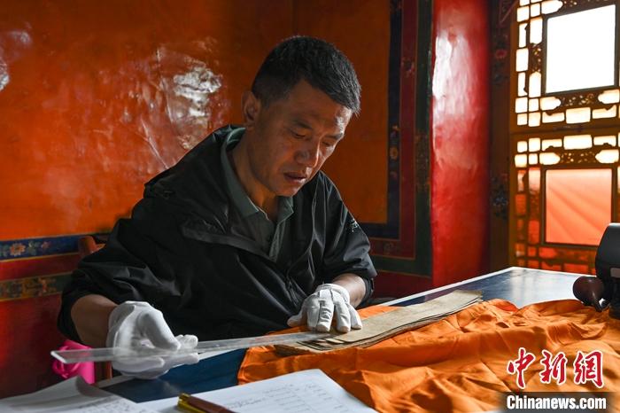 圖為6月27日,拉薩,西藏自治區(qū)藏醫(yī)院文獻(xiàn)研究所相關(guān)負(fù)責(zé)人次旦平措對(duì)交接而來(lái)的古籍檢查測(cè)量尺寸。 中新社記者 趙朗 攝
