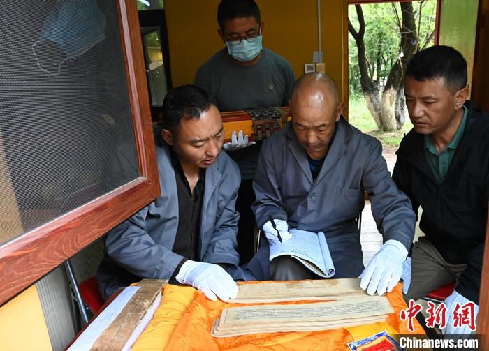 圖為6月27日,拉薩,羅布林卡管理處兩位專(zhuān)職古籍審核人員(左一、左三)登記檢查古籍并做交接。 中新社記者 趙朗 攝