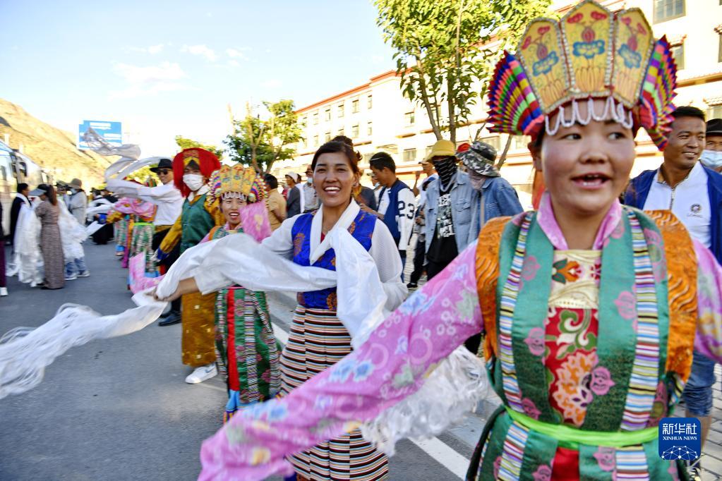 7月15日傍晚,貢嘎縣的干部群眾歡迎先期運(yùn)送家具的雙湖縣搬遷群眾。新華社記者 張汝鋒 攝