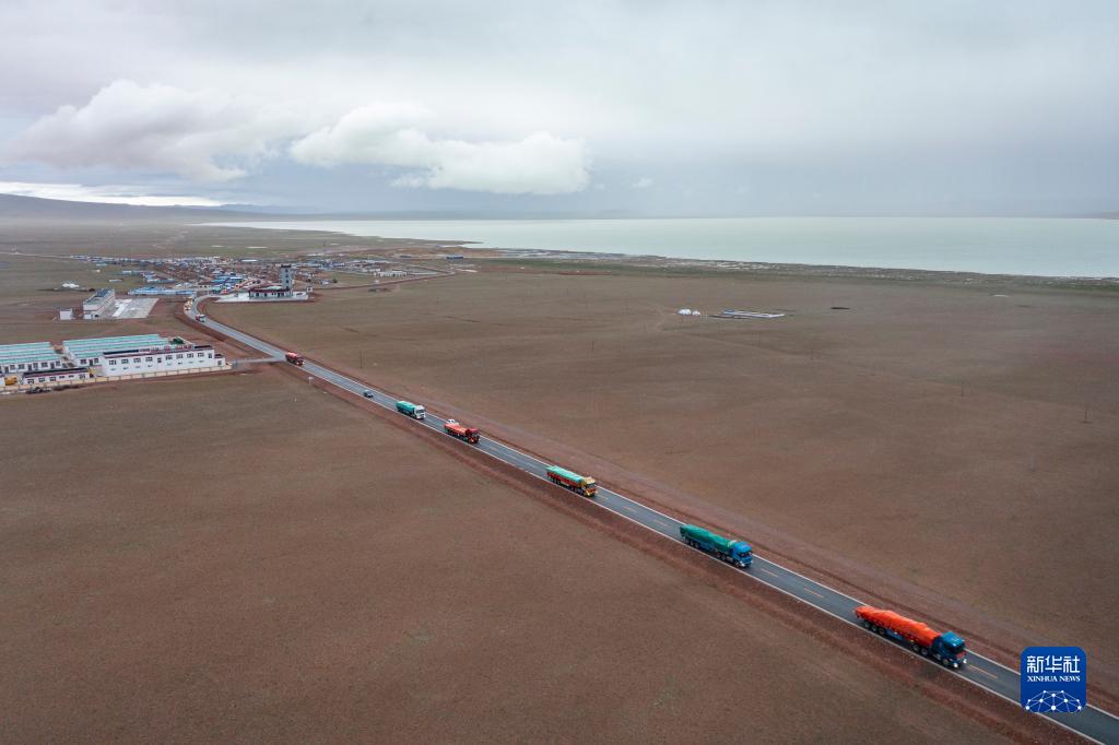 先期運(yùn)送家具的貨運(yùn)車隊(duì)從雙湖縣多瑪鄉(xiāng)出發(fā)(7月15日攝,無(wú)人機(jī)照片)。新華社記者 孫非 攝