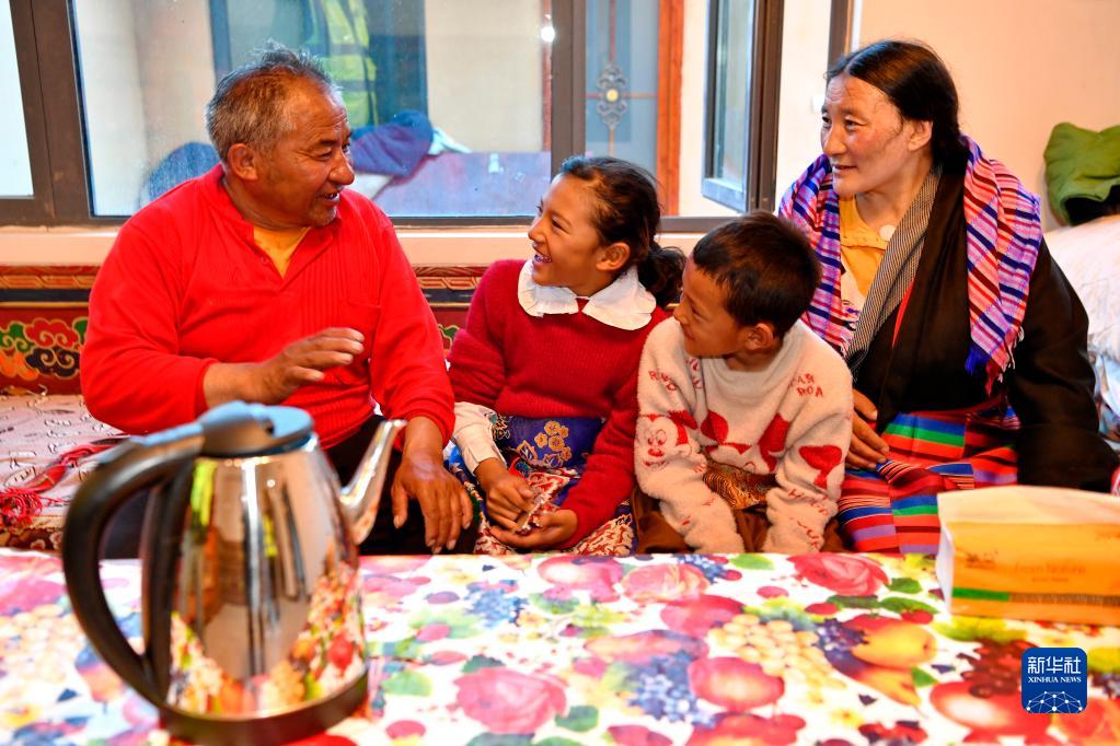 剛剛從雙湖縣多瑪鄉(xiāng)搬遷到森布日安置點(diǎn)新居的牧民索朗措加(左一)和妻子查格(右一),與孫女旦珍卓嘎(左二)和孫子歸桑桑旦一起聊天(7月19日攝)。新華社記者 張汝鋒 攝