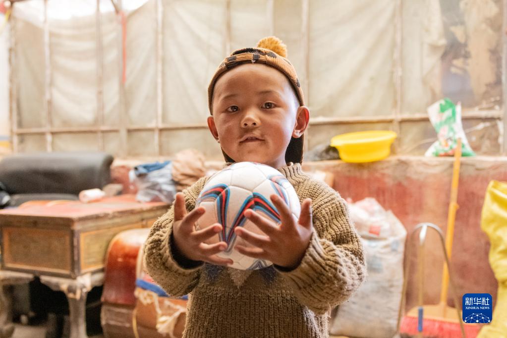 在雙湖縣多瑪鄉(xiāng)果根擦曲村,三歲的洛桑赤勒手里抱著足球(7月12日攝)。新華社記者 周荻瀟 攝