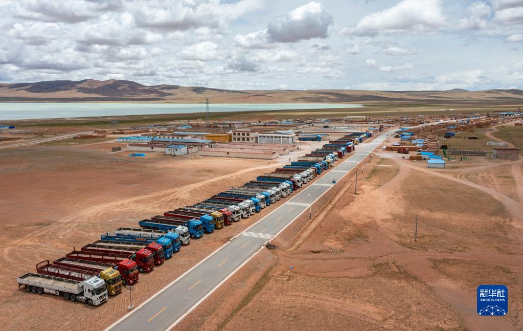 在雙湖縣多瑪鄉(xiāng)拍攝的負責(zé)運送搬遷群眾家具的貨車(7月12日攝,無人機照片)。新華社記者 孫非 攝