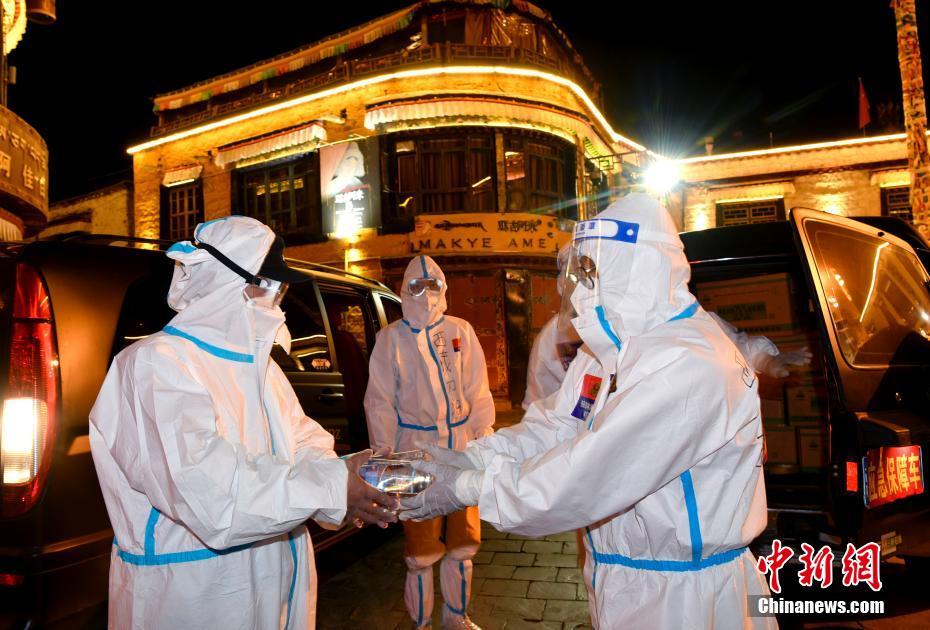 8月14日,西藏拉薩,志愿者在八廓街內(nèi)為防疫人員送去抗疫物資。當(dāng)日,拉薩市應(yīng)對新冠肺炎疫情工作領(lǐng)導(dǎo)小組決定,至8月15日凌晨3時的拉薩主城區(qū)消殺管理時間,再延長三天至8月18日凌晨3時,在拉薩主城區(qū)以社區(qū)網(wǎng)格為基本單位,快速精準開展多輪全員核酸篩查。 中新社記者 李林 攝
