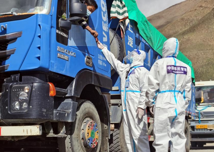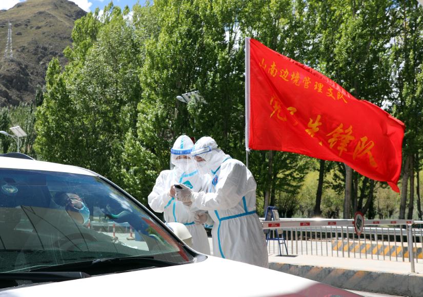 圖為西藏山南邊境管理支隊(duì)機(jī)關(guān)“黨員先鋒隊(duì)”移民管理警察在查驗(yàn)人員核酸檢測(cè)報(bào)告。徐道超 攝