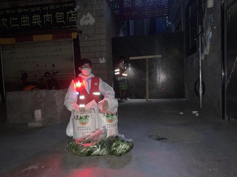 8月22日,正在嘎瑪貢桑志愿服務(wù)的救援隊(duì)隊(duì)員李正煒聯(lián)系社區(qū)工作人員,核實(shí)情況,了解這個(gè)家庭的需求后,副隊(duì)長朱奕霖采購物資,晚上隊(duì)長陳雷將嘉措居委會、八一社區(qū)、第十一安居苑等社區(qū)的捐贈(zèng)防疫物資配送完畢后,回到東郊,將糌粑、蔬菜等食品送往嘎瑪貢桑高風(fēng)險(xiǎn)區(qū),交到了救助家庭人員的手中。