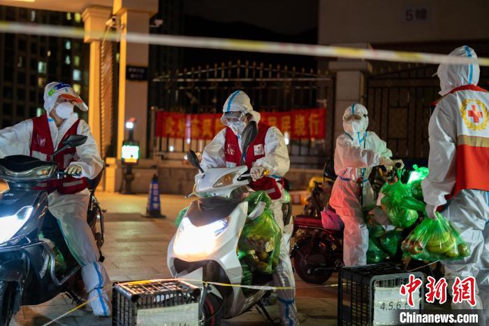 防疫志愿者逐個(gè)為居民派送蔬菜水果等生活物資。江飛波 攝
