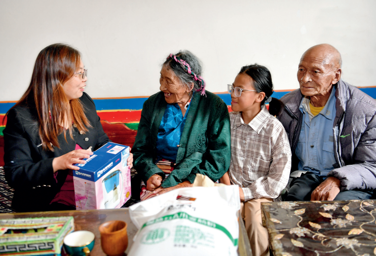 王玉秀(左一)來(lái)到拉薩市達(dá)孜區(qū)德慶鎮(zhèn)次旦老人家走訪(fǎng)并送上慰問(wèn)品(2022 年 7 月 27 日攝) 張汝鋒攝