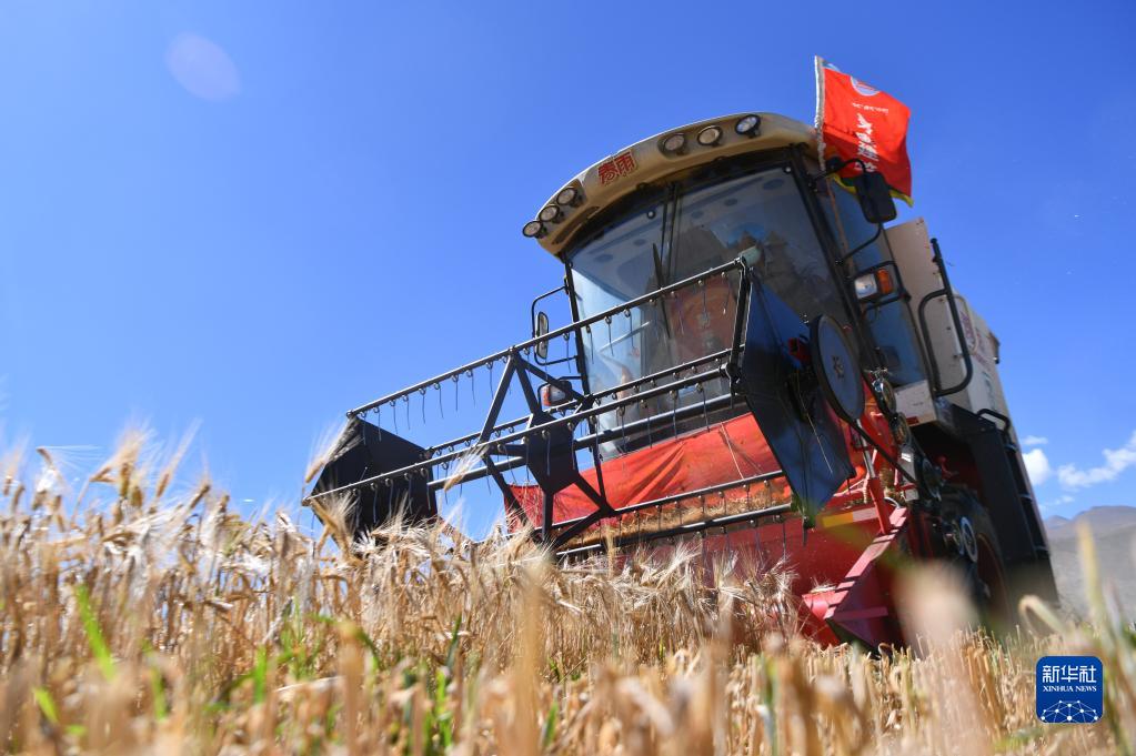 西藏日喀則市江孜縣熱索鄉(xiāng)努康村農(nóng)機(jī)合作社的村民集中對村里三千多畝耕地進(jìn)行機(jī)械化收割(9月19日攝)。新華社記者 晉美多吉 攝