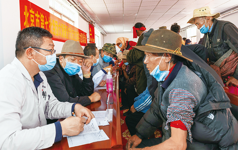 2022年6月9日,來(lái)自拉薩市人民醫(yī)院的北京市第七批“組團(tuán)式”援藏醫(yī)療專(zhuān)家,來(lái)到當(dāng)雄縣格達(dá)鄉(xiāng)為居民義診?!⌒氯A社記者 周荻瀟/攝