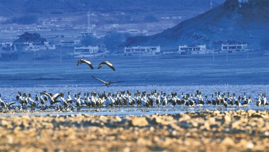 西藏自治區(qū)林周縣虎頭山水庫一帶的黑頸鶴群。